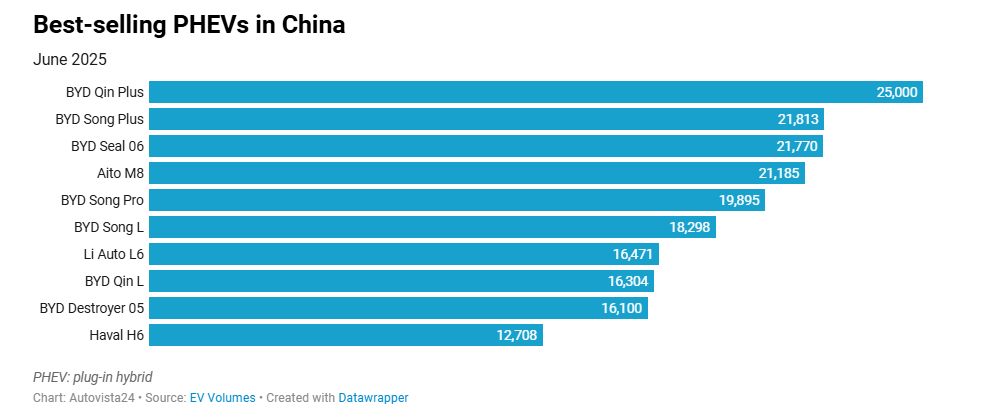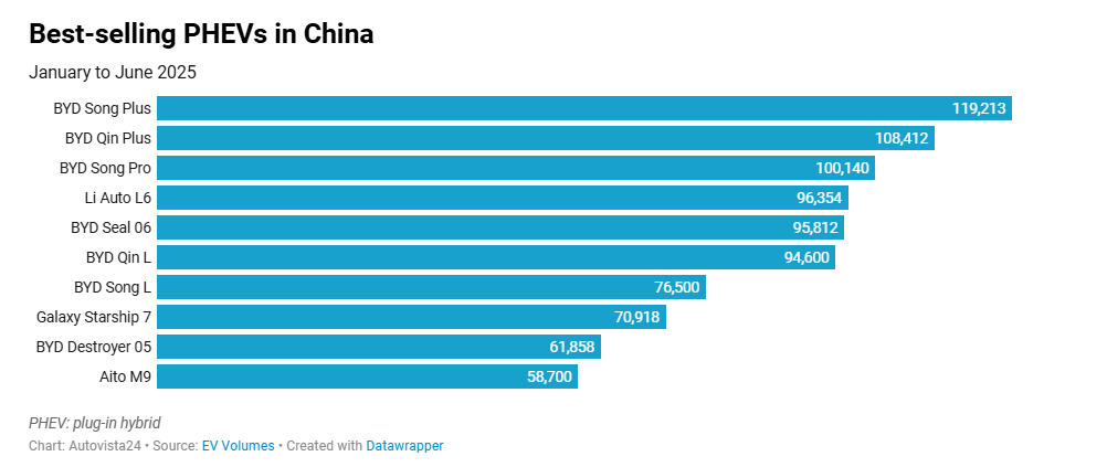 The BYD Destroyer 05 re-entered the table in ninth, having dropped out in April. It managed 61,858 sales in the first six months of 2025, equating to a 2.5% share of the PHEV total. Rounding out the top 10 was the Aito M9, with 58,700 deliveries and a 2.4% market share.
