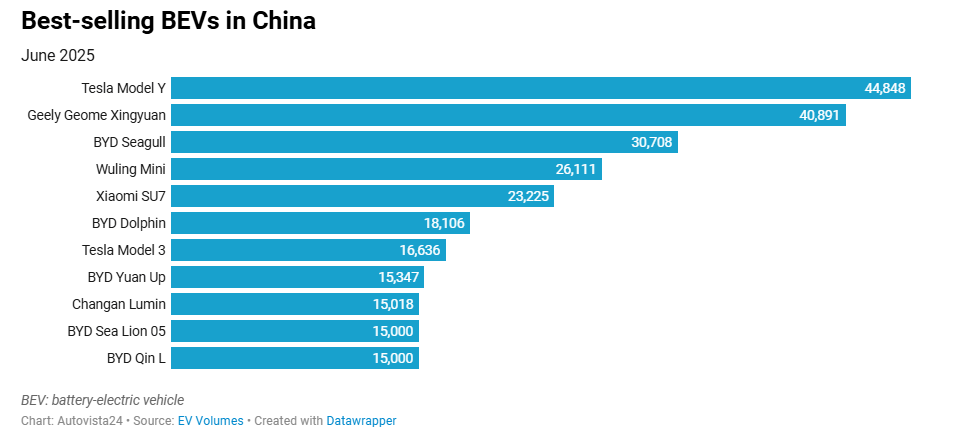 June’s outcome created multiple changes in the overall results for the first half of 2025. The BYD Seagull rose to second position, taking a 5% market share with 174,912 units delivered.
