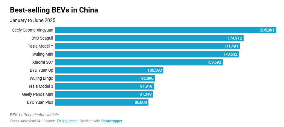 In ninth, the Geely Panda Mini was 670 units behind, having achieved 91,249 deliveries in the first half of 2025. It secured a 2.6% share of the BEV total.